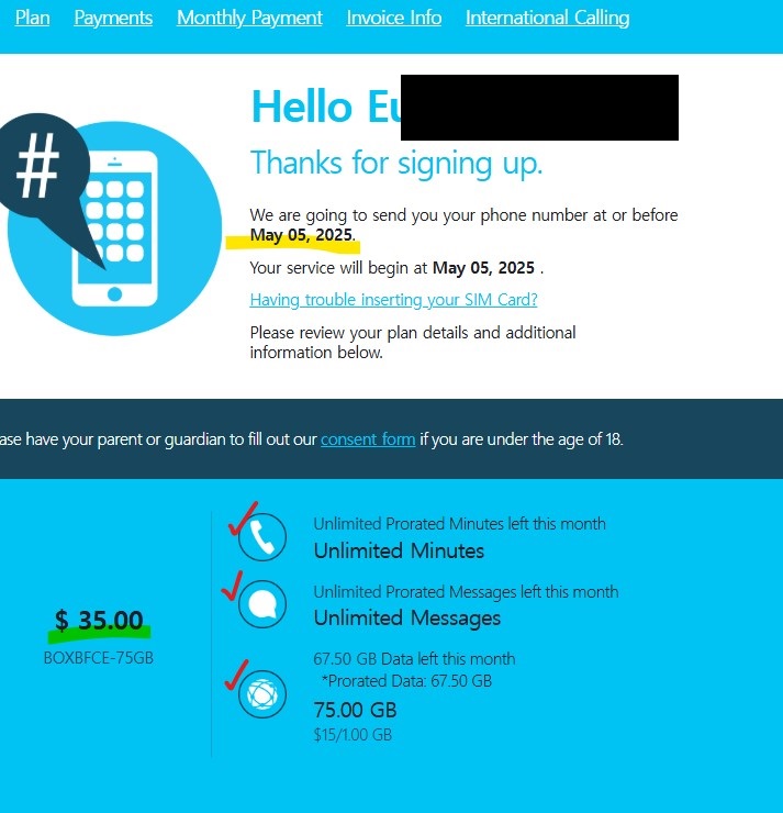유심비용 19,900 원, 월 플랜 비용 약 35,000원에 캐나다 문자, 통화 무제한 데이터 75GB 사용가능!!